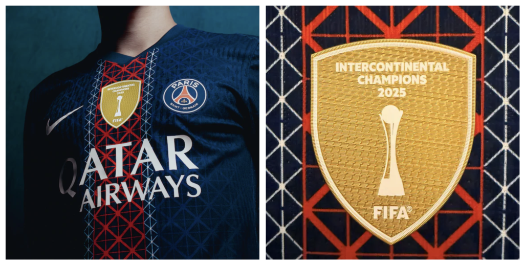 On the home and away kits, the gold Intercontinental Champions badge is positioned centrally, between the Nike logo and the PSG crest. Some uncertainty remains regarding the placement on the red third kit, where the club crest is centered; PSG has not yet confirmed the exact layout for that version.