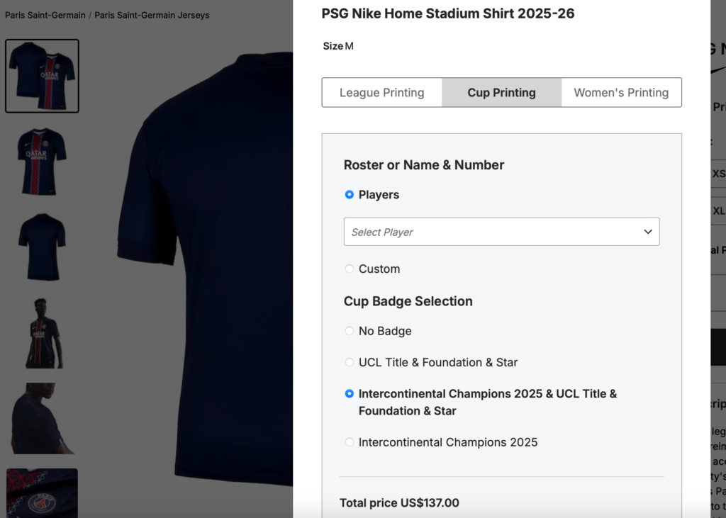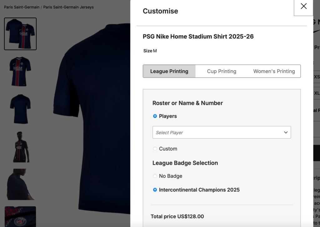 When selecting a PSG shirt on the official store, fans can choose their size and then click on “Customize”. From there, several badge options are available, including league and cup patches, with the addition of the Intercontinental Champions 2025 badge priced at $10.